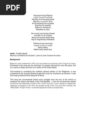 Contemporary Artists Docx Freddie Aguilar Awards U2022best Musician Songwriter Because Of U201cbayan Ko And Anak U201d U2022awit Award For Best Novelty Course Hero - Aside from being the unofficial national anthem next to the official anthem lupang hinirang, it depicts the pain of a country, that its now more popular filipino version of the lyrics which is attributed to the filipino poet jose corazon de jesus.